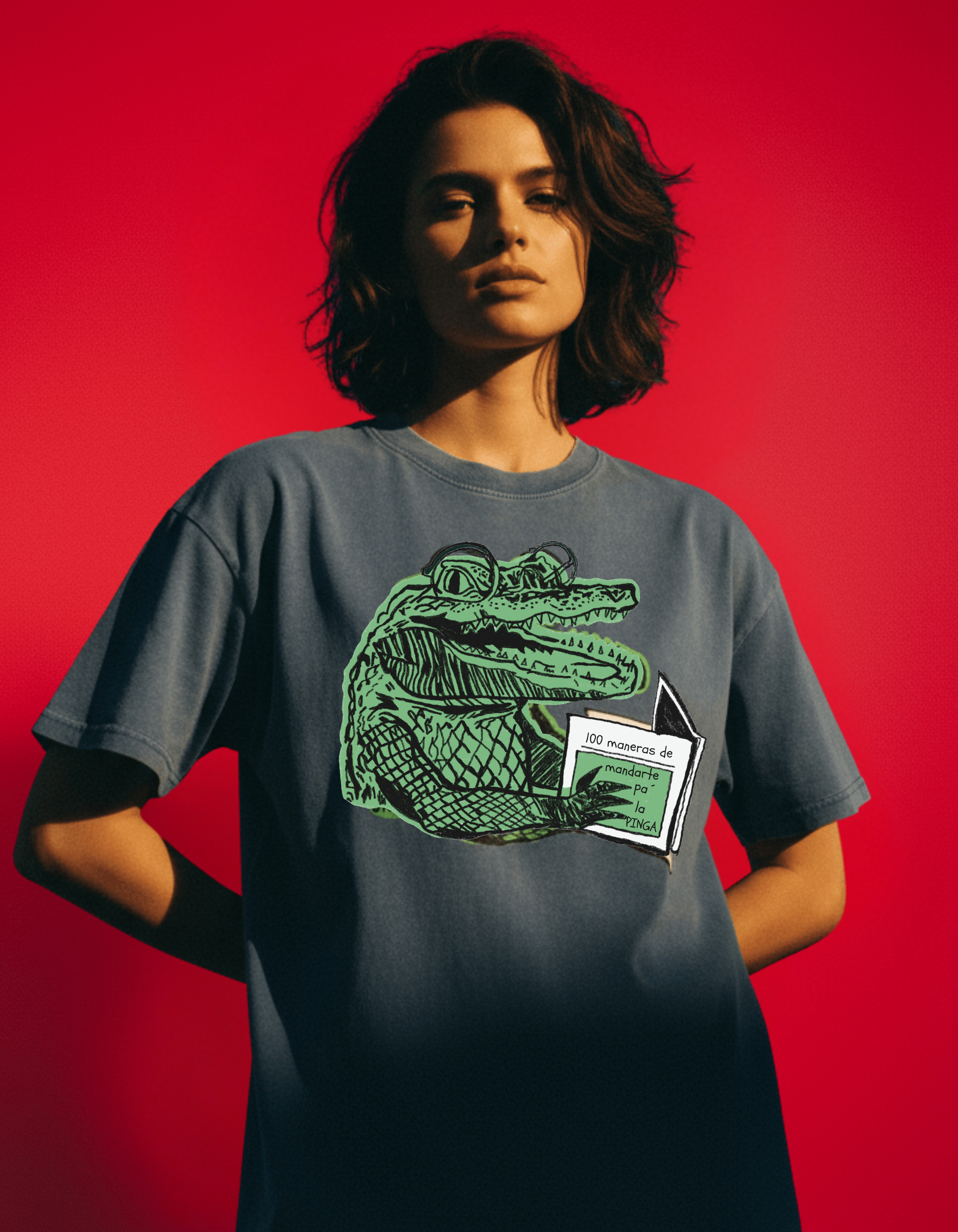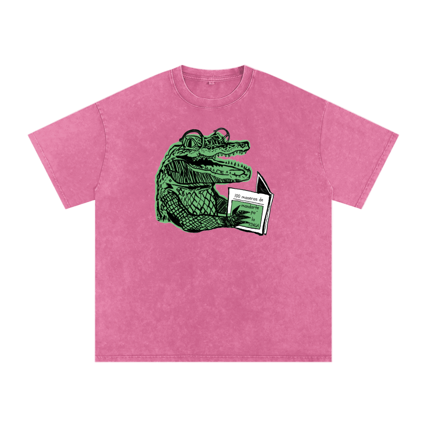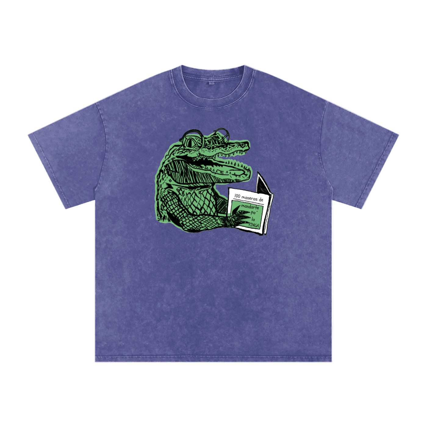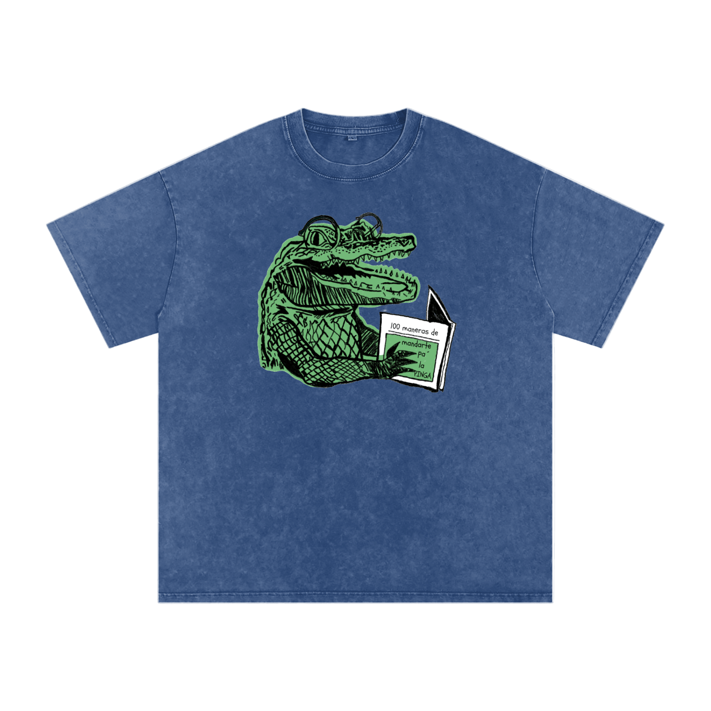 Smart, savage, and very Cuban. This tee features a hand-drawn green crocodile wearing glasses and reading a book titled “100 maneras de mandarte pa’ la PINGA.” It’s cheeky island humor with librarian energy—perfect for anyone who prefers wit with a bite.